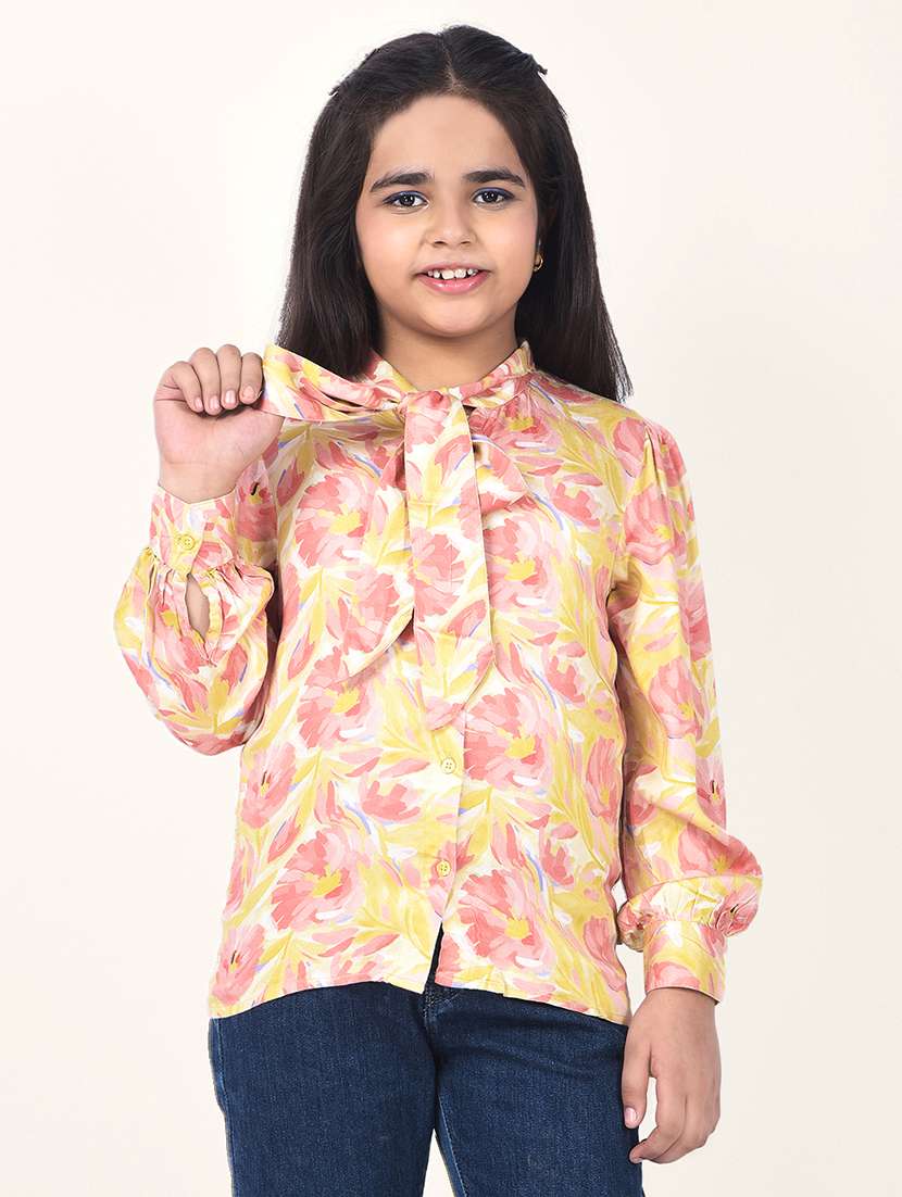- » girls printed tie-up neck long sleeve top