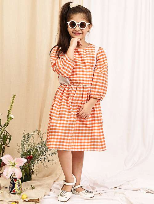 DESIGN: Charming Peach and white gingham check pattern dress featuring elegant puff sleeves and a gathered waist for a classic look