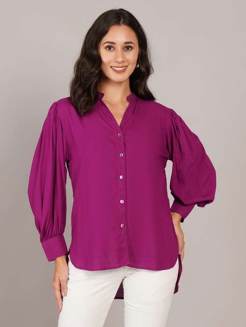 - » women solid puff sleeve high low shirt