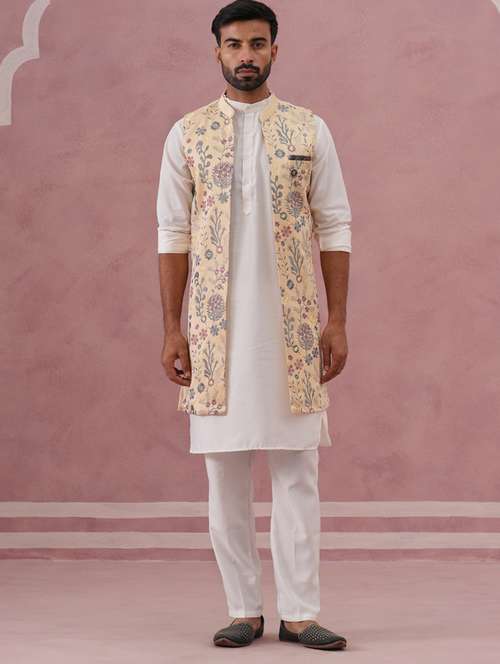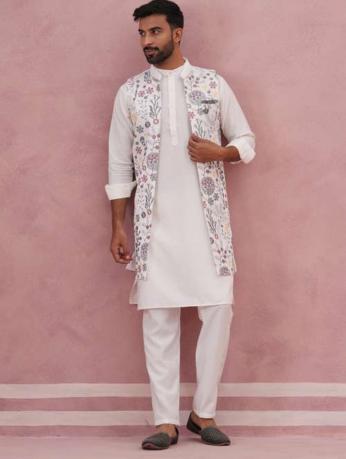 This festive kurta set comes with a delicately embroidered long shrug in soft pastel tones, adding a graceful touch to the traditional silhouette. Paired with a solid white kurta and pyjama, the ensemble offers a refined and contemporary ethnic look ideal for weddings, festivals, and family gatherings.
