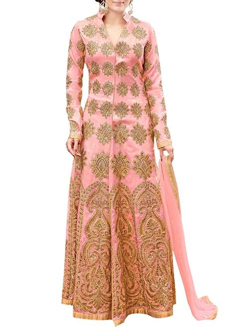 - » pink art slk embroidered flared semi-stitched suit