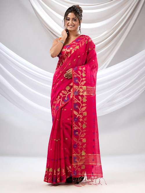 Hot Pink Cotton Blend Handwoven Saree With Floral Nakshi Borders