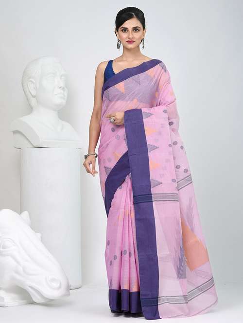 Add a touch of charm to your ethnic collection with this handwoven Tant cotton saree in soft pink, beautifully complemented by a deep purple border. Crafted with Bengal’s weaving artistry, this saree is lightweight, breathable, and perfect for all-day wear while exuding timeless elegance. The pastel pink body is adorned with woven temple-style motifs and dotted patterns in subtle shades, highlighted by the striking purple border and pallu. Its airy texture makes it an ideal choice for festive occasions, office wear, or casual gatherings. Pair it with silver jewelry and a stylish blouse to complete the look.