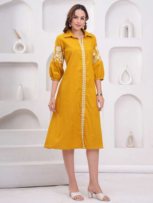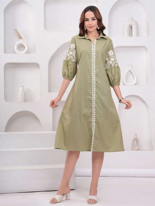 - Dress up in a soothing pattern and don this dress made of cotton material.