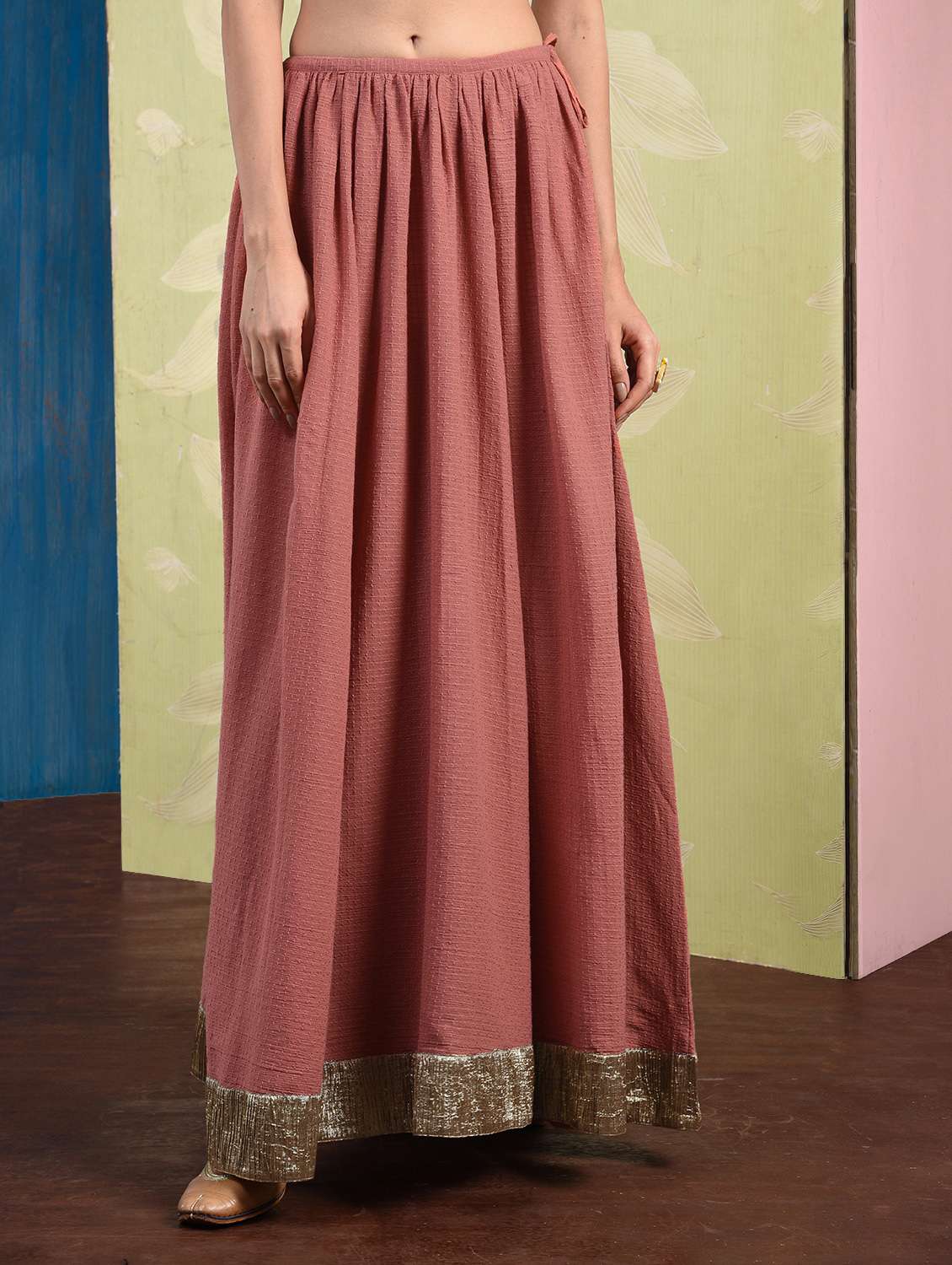 gold lace border flared skirt with drawstring