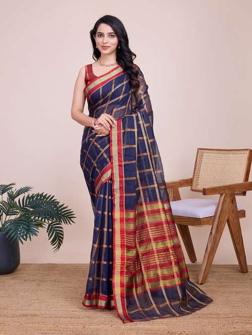 women checkered bordered saree with blouse