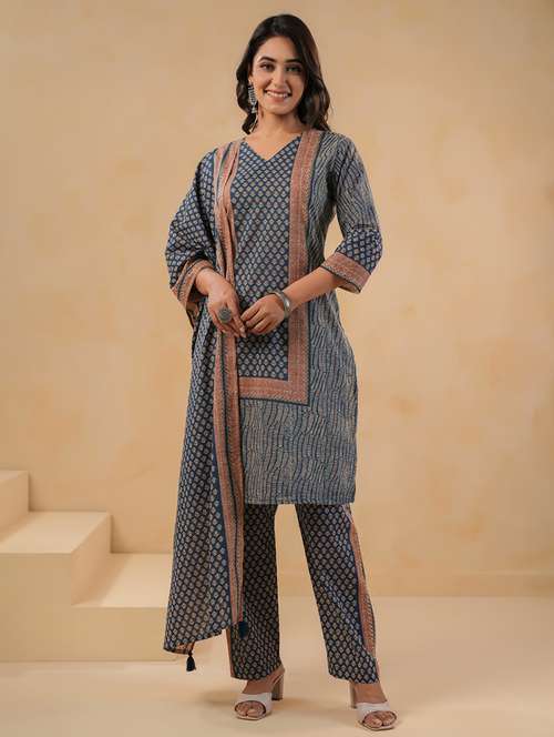 - Browse through the latest range of ethnic sets for women with tailored sleeve designs with traditional works.