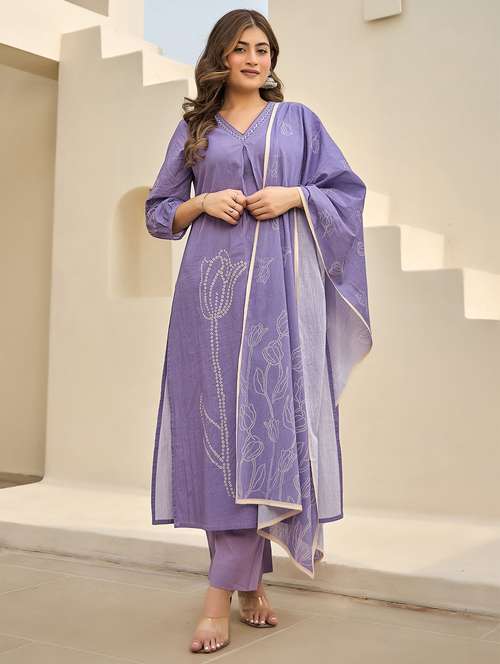- Browse through the latest range of ethnic sets for women with tailored sleeve designs with embroidered works.