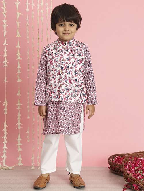 boy pink floral print kurta set with nehru jacket