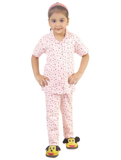 Introducing our charming Pink Cotton Blended Night Dress for girls aged 1-6 years, adorned with vibrant red floral prints. This delightful set features a comfortable half-shirt and cozy pajama bottoms, offering both style and comfort for a sweet bedtime look your little one will adore.