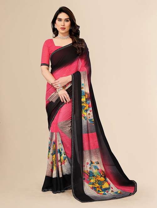 This pink and black printed georgette saree offers the perfect blend of modern prints and classic elegance. Its lightweight fabric ensures comfort, while the intricate lace border adds sophistication. Whether for a casual outing or a day at the office, this saree provides both style and comfort in one elegant package. Pair with a solid black or pink blouse to keep the look cohesive, and add minimal jewelry for an understated yet chic look.