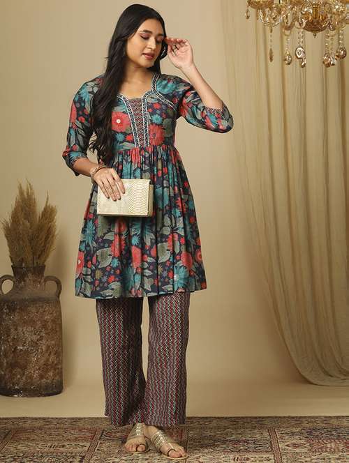 - » women's pink allover floral printed peplum tunic & partially elasticated chevron print trouser co-ords set