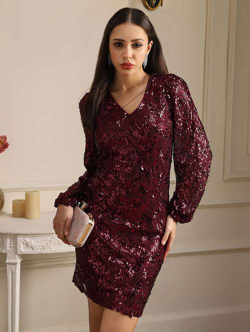 Glam meets grace in this pink embellished mini bodycon dress. Designed with a V-neckline and bishop sleeves, it perfectly balances sparkle with elegance. The fitted silhouette flatters your shape, while the zip closure ensures comfort. Ideal for evening parties or club nights.