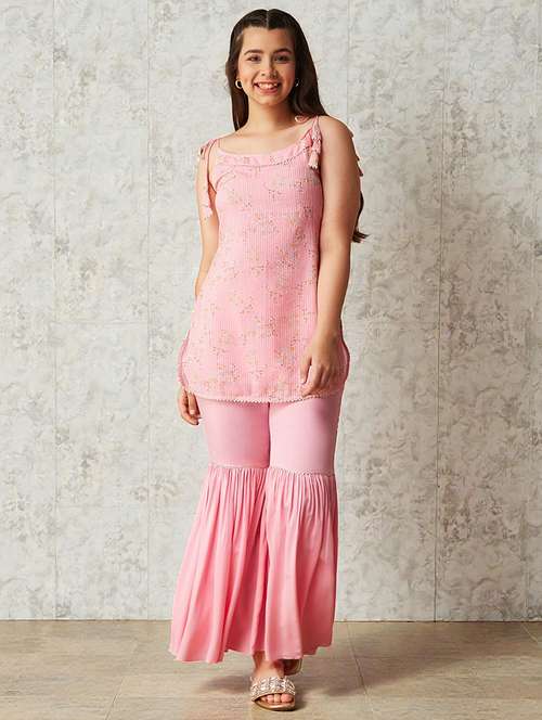 - » girls floral print sleeveless kurta and sharara set