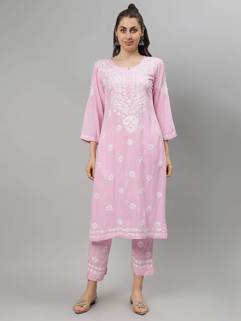 women chikankari three quarter sleeve kurta pant set