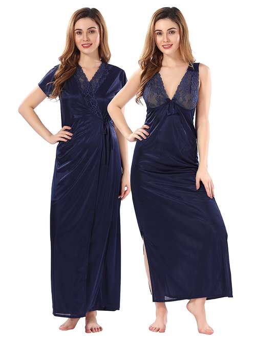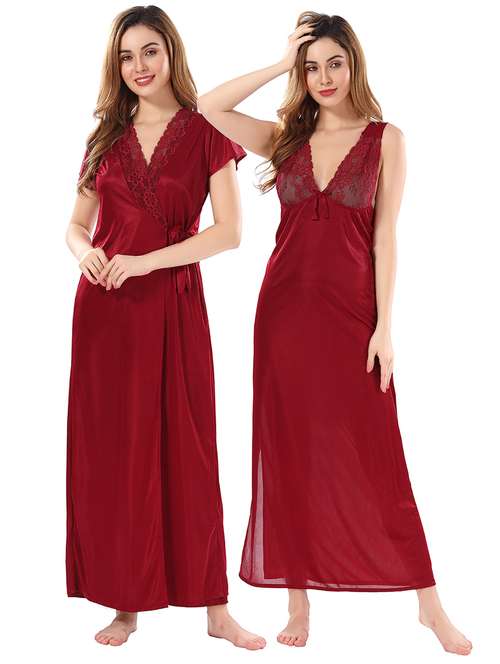 Make your nights seductive & stylish with this 'Nighty with Robe' from the brand 'Be You'. Made up of Satin The robe has side tie up details with Half sleeves. The Satin nighty has broad shoulder straps, lacy chest panel & elastic at the back for perfect fit.