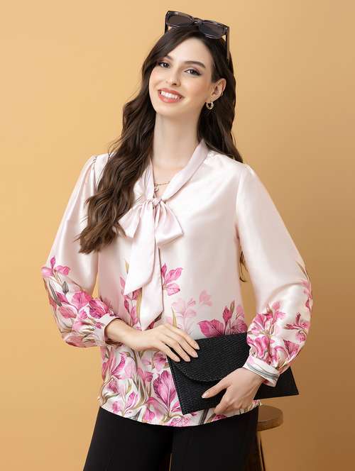 This satin top with tie-up neck and placement print pairs beautifully with black trousers, white palazzos, or structured skirts, offering versatile styling options for day and evening wear.