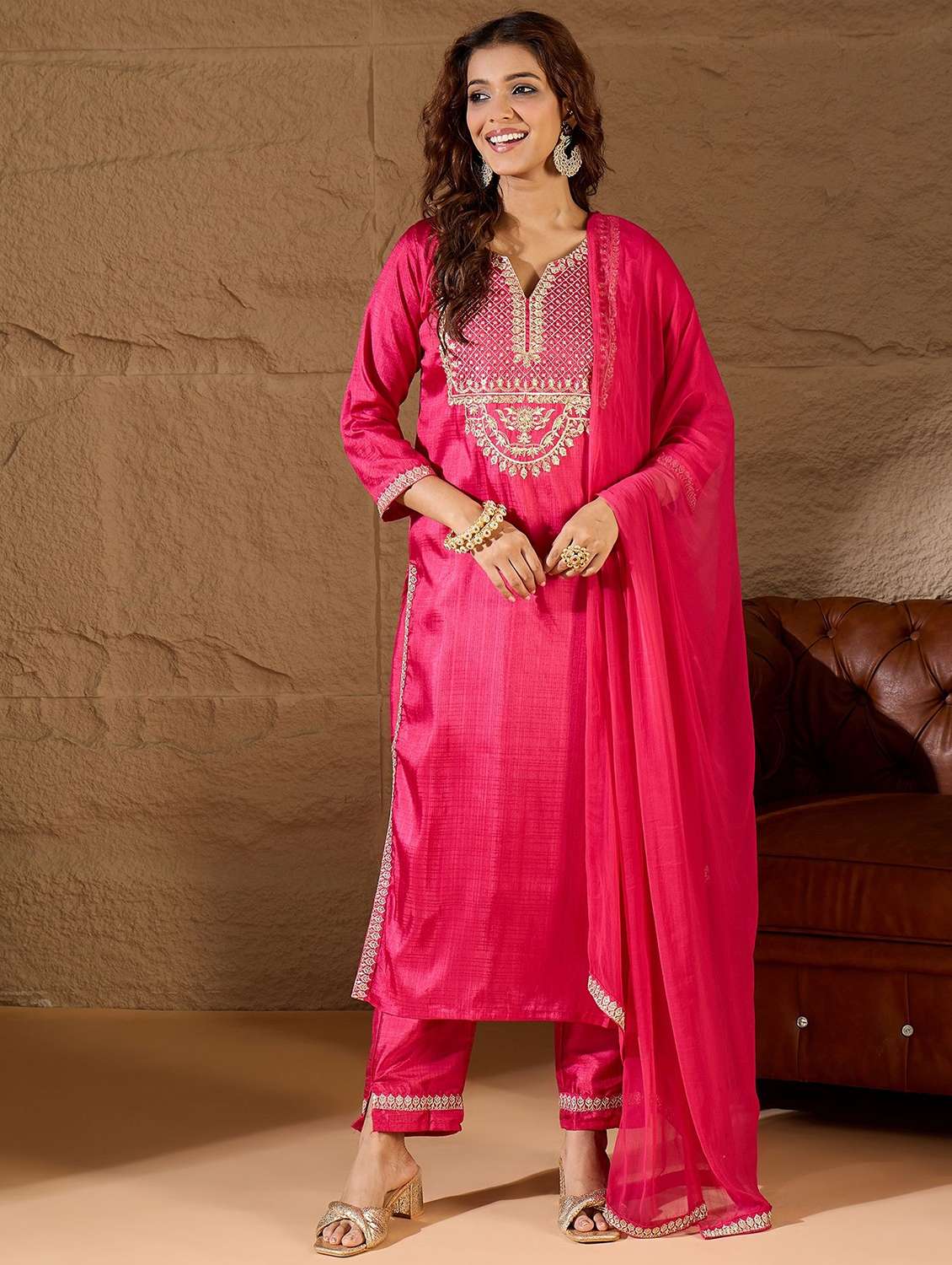 • Find gorgeous sets of ethnic wears in trending designs in pink colors suitable for festive wear of occasions.
