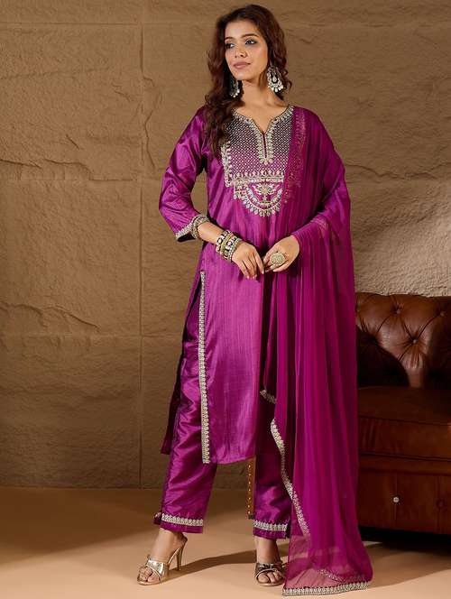 • Browse through the latest range of ethnic sets for women with tailored sleeve designs with embroidered works.