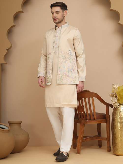 - » men embroidered mandarin neck kurta pyjama with jacket ethnic wear set