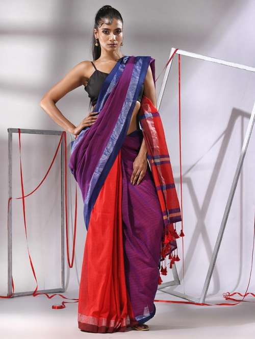 Look royal and loving in this purple cotton soft saree. It has woven designs and patterns for a beautiful look.