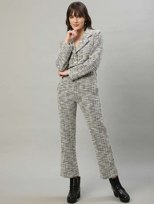 Tweed crop lined jacket with twin front button closure, long sleeves, straight leg trouser with hidden closure at waist