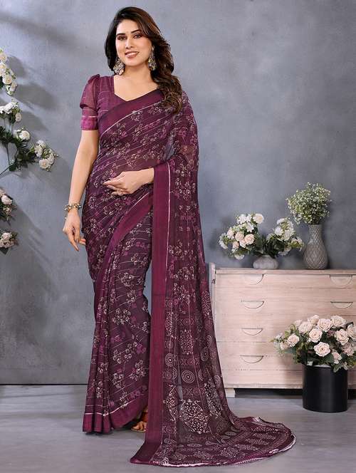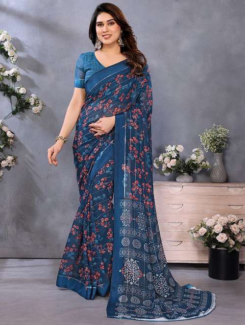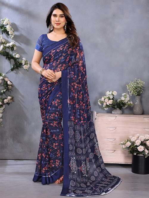 Georgette Fabric Made Floral Print Zari Embellished Saree With Satin Border. Premium Georgette Fabric Soft, flowy & lightweight material for elegant draping, Zari Embellishment Throughout Intricate zari work adds festive shimmer and richness