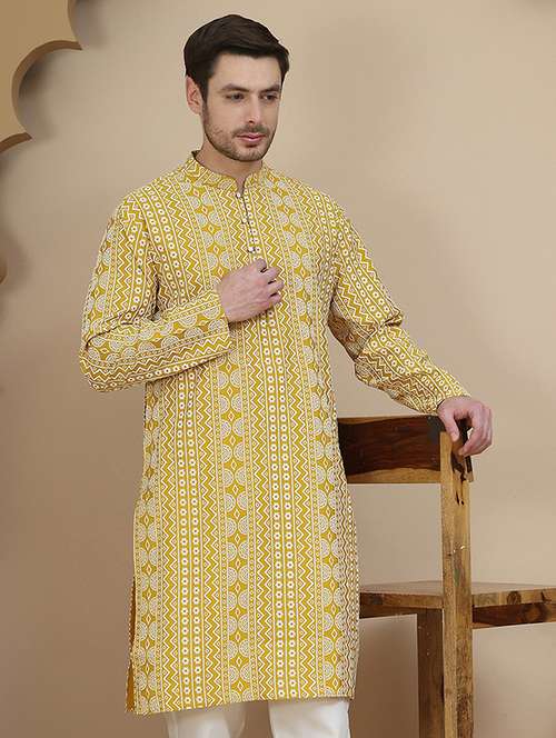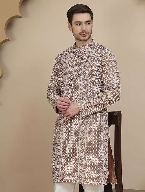 this Purple Geometric Print Silk Blend Straight Kurtas for Men. Crafted from a premium silk blend, this kurta features an all-over intricate white geometric print that gives a modern twist to traditional attire. The rich purple hue offers a regal flair, while the detailed motifs lend a vibrant ethnic vibe.
