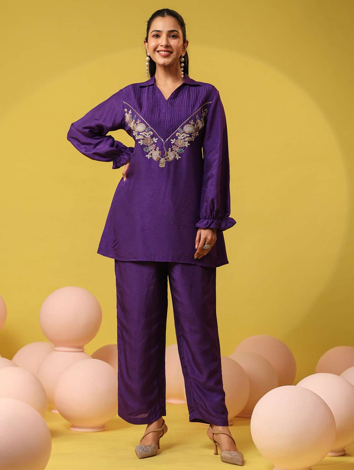 women solid with work long sleeve ethnic co-ord set