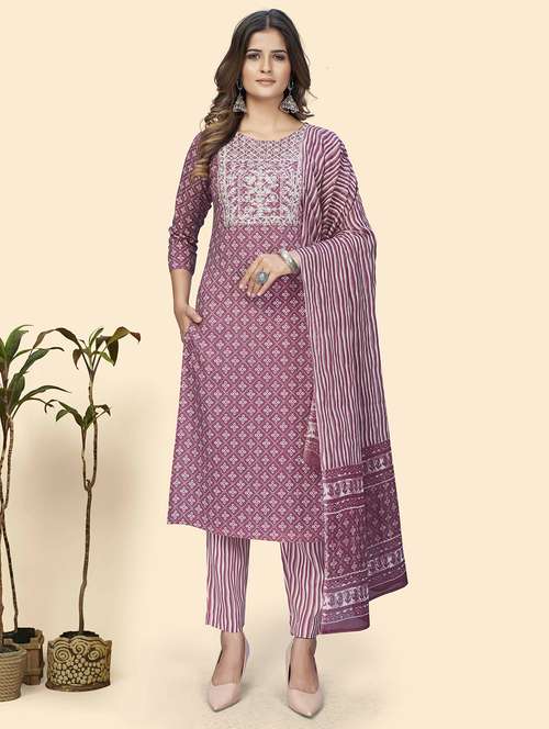 - Find gorgeous sets of ethnic wears in trending designs in purple colors suitable for casual wear of occasions.