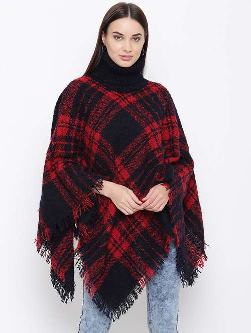 - » fringed hem checkered poncho