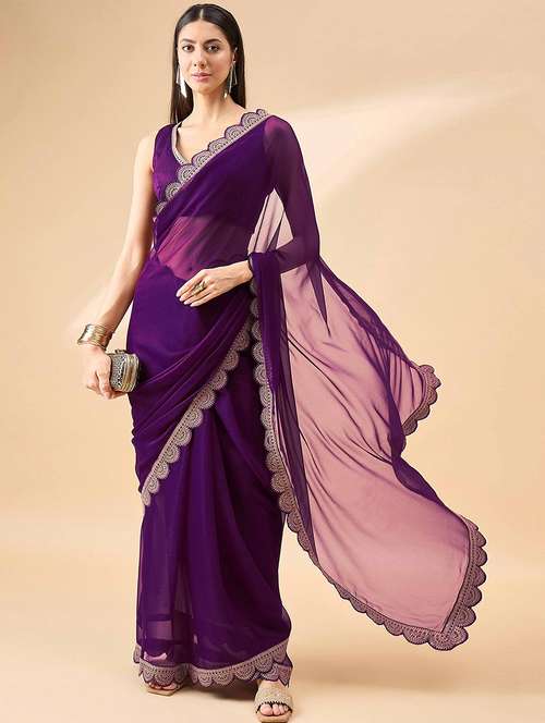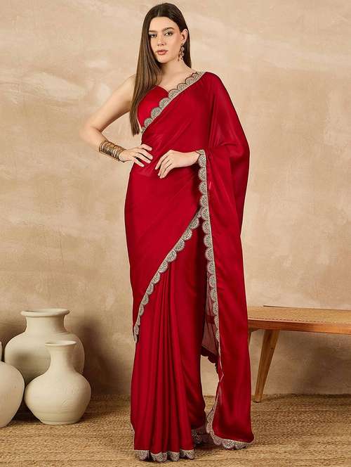 This elegant Red satin chiffon saree features a solid design beautifully enhanced with a sequins embroidered border, adding a touch of sparkle to its graceful look. The lightweight chiffon fabric drapes effortlessly, offering both comfort and elegance for long wear. It is paired with an unstitched Banglori blouse piece, which can be tailored to suit your personal style. Perfect for parties and festive functions, this saree combines simplicity with subtle shimmer for an eye-catching appearance.