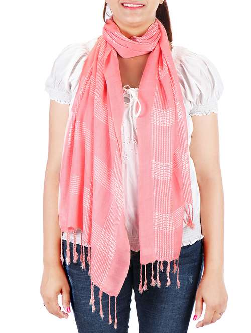 Anekaant coral checkered viscose lurex stole. Has fringes ends. Size: 70x180 Cm