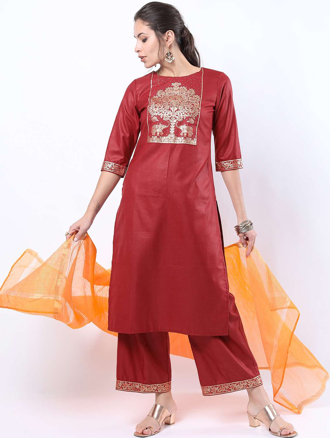 - Find gorgeous sets of ethnic wears in trending designs in red colors suitable for casual wear of occasions.