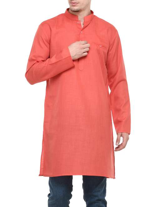 solid coral cotton long kurta - 13910920 - Very Small Image - 1