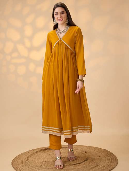 • Browse through the latest range of ethnic sets for women with tailored sleeve designs with gota patti works.