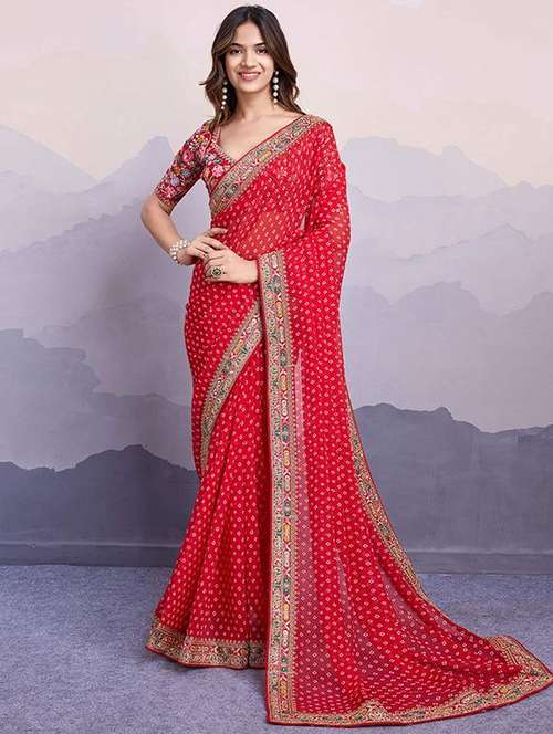 women red bandhani printed lace work saree with blouse - 21728396 -  Standard Image - 1 women red bandhani printed lace work saree with blouse - 21728396 -  Zoom Image - 1