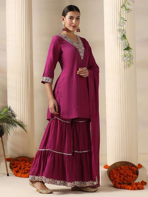 - Save your time mixing and matching various ethnic pieces and invest in beautiful kurta sharara set ethnic sets from SHREE brands that give a well-fitted look in all styles.