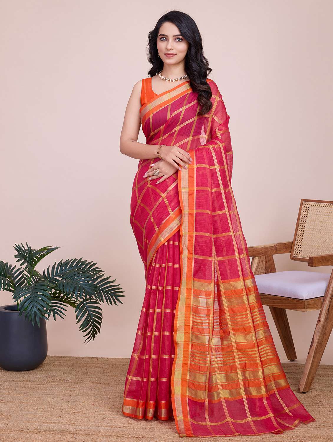 women checkered bordered saree with blouse
