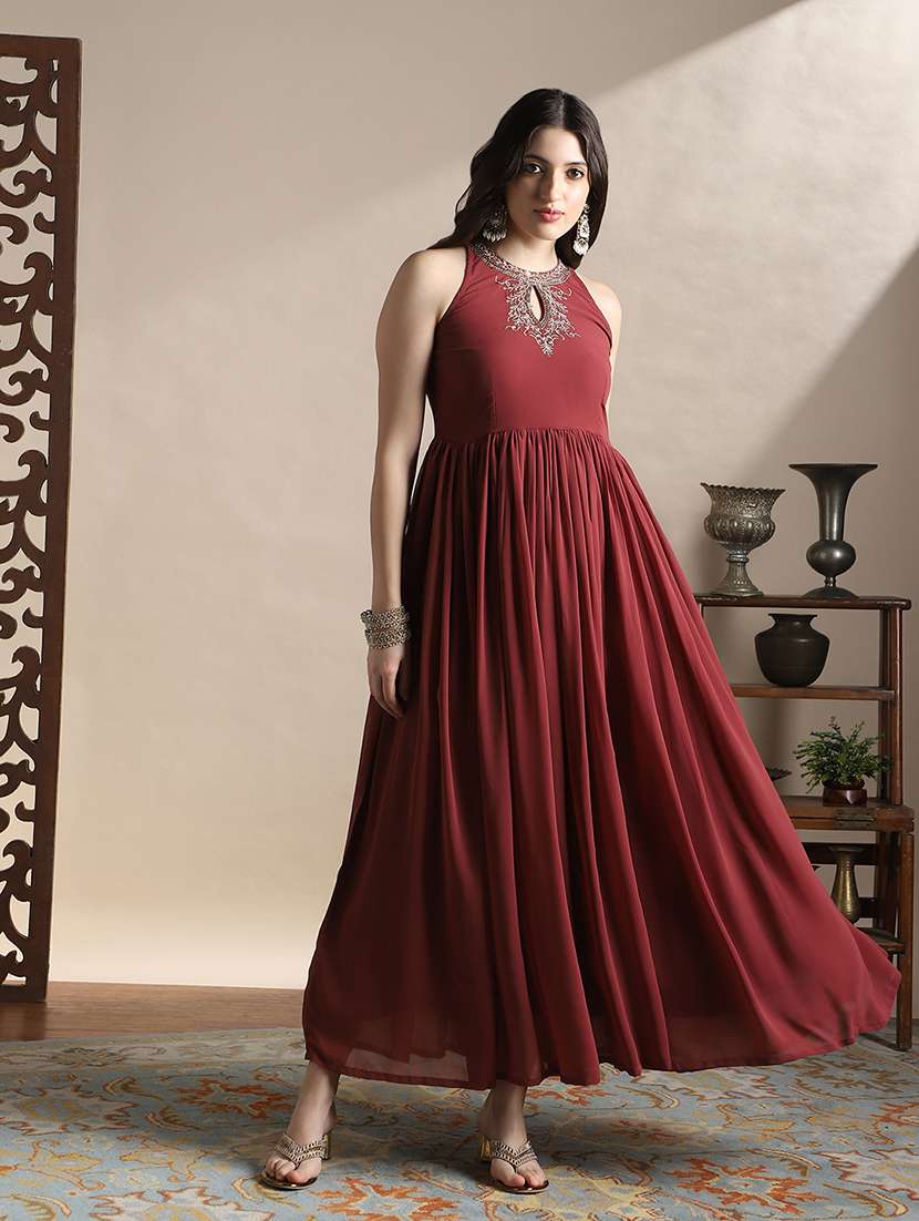 globus women rust halter keyhole neck sequinned & embroidered detail gathered maxi flared festive dress
