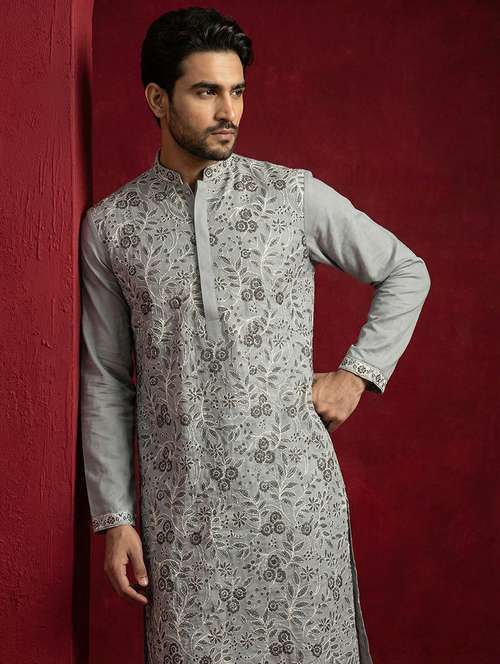 men solid with work mandarin neck long kurta