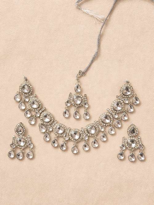 Elevate your ethnic look with this exquisitely crafted silver-tone kundan necklace set featuring a statement necklace, matching earrings, and a coordinated maang tikka. Designed with sparkling clear kundan stones in elegant teardrop and round cuts, this set reflects timeless craftsmanship with a modern finish. The intricate detailing and balanced drop design make it ideal for weddings, festive celebrations, and traditional occasions. Lightweight yet regal, this jewellery set enhances sarees, lehengas, and anarkalis with effortless grace, making it a must-have addition to your ethnic jewellery collection.
