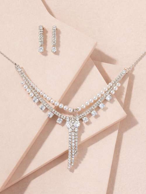 Elevate your look with this premium silver-tone jewellery set featuring a graceful blend of sparkling crystals and classic pearls. Designed to deliver a luxurious finish, the necklace showcases finely cut stones with a stunning central drop that adds elegance and movement, while the matching earrings complete the set beautifully. Crafted for special occasions, festive wear, weddings, and evening parties, this jewellery set reflects superior shine, balanced proportions, and timeless appeal. The neutral silver and pearl tones make it versatile and easy to style with ethnic as well as fusion outfits.