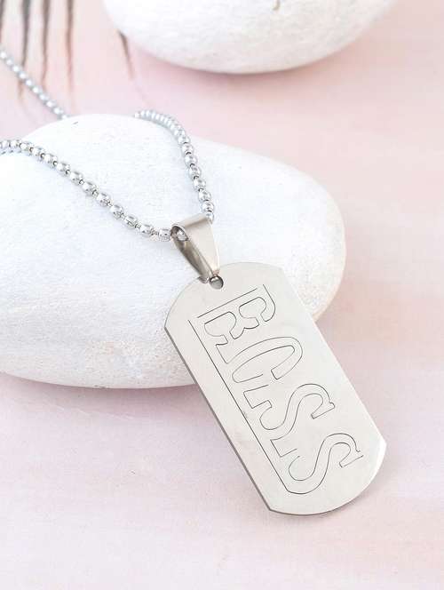 Make a bold statement with this innovative stainless steel pendant featuring a unique BOSS letters design. The distinctive cavity cut-out style showcases a cleverly engineered BOSS motif that protrudes from the base while remaining securely attached to the main pendant. Crafted from durable stainless steel, this contemporary accessory comes with a matching ball chain that adds a modern touch to the overall design. Perfect for both men and women who appreciate edgy accessories, this pendant makes a striking addition to casual outfits. Its versatile styling makes it suitable for various occasions - from college gatherings to casual outings. The pendant's sleek metallic finish and dimensional design create an eye-catching effect that's sure to draw attention. The robust construction ensures long-lasting wear, while the neutral silver tone complements any wardrobe choice. This fashionable piece serves as an ideal accessory for young adults seeking to express their unique style.