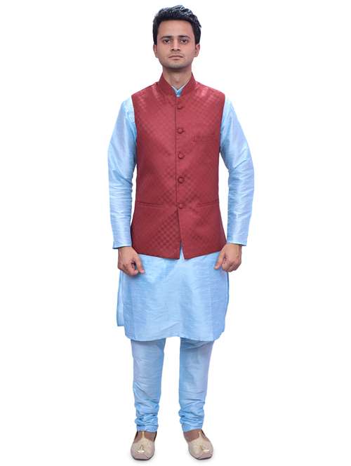 - » sky blue silk blend kurta pyjama with jacket ethnic wear set