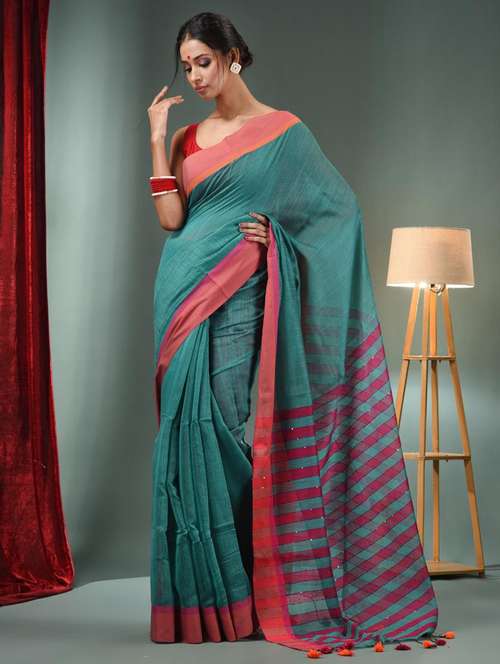 Look royal and loving in this teal handwoven cotton blend handloom saree. It has woven designs and patterns for a beautiful look.