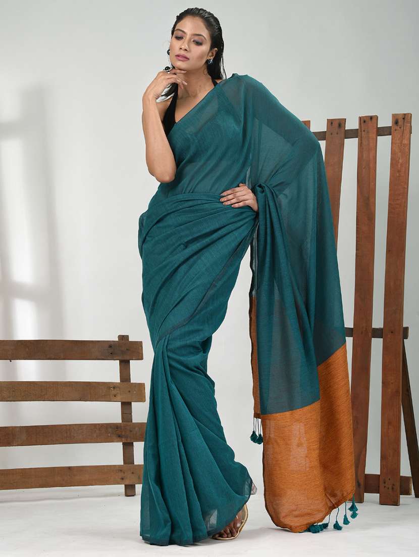 Indulge in sophisticated comfort with Teal Cotton Soft Saree With Solid Pattern, a fusion of softness and elegance. Combine it with a stylish blouse for a modern touch or enhance it with statement jewelry for a touch of glamour.