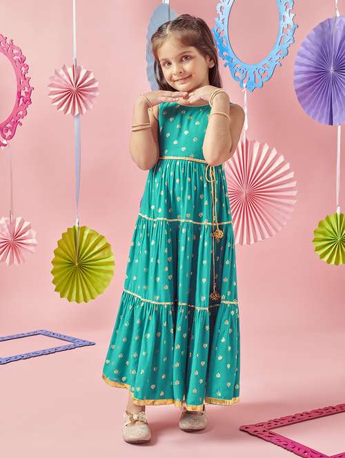 MASTARANG 11-12Years Girl's Indianwear Maxi Dresses ALL OVER FOIL PRINT GOWN WITH BELT AND TASSELS In Blended Fabric With Sleeveless