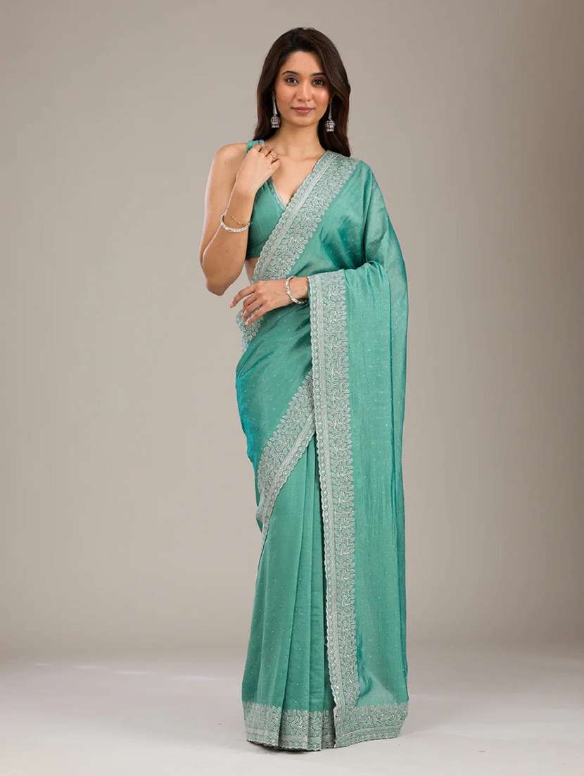 Color : Rama, Made from high-quality Vichitra Silk Fabric Embroidered Saree, giving the saree a stunning look and feel.If you're looking for a beautiful saree to wear to a special occasion, this women's Vichitra Silk Embroidered is sure to impress. With a length of 5.50 meters and an additional 0.80 meters of Vichitra Silk unstitched blouse material. Available in various colors, this saree is perfect for weddings, parties, and other special occasions.