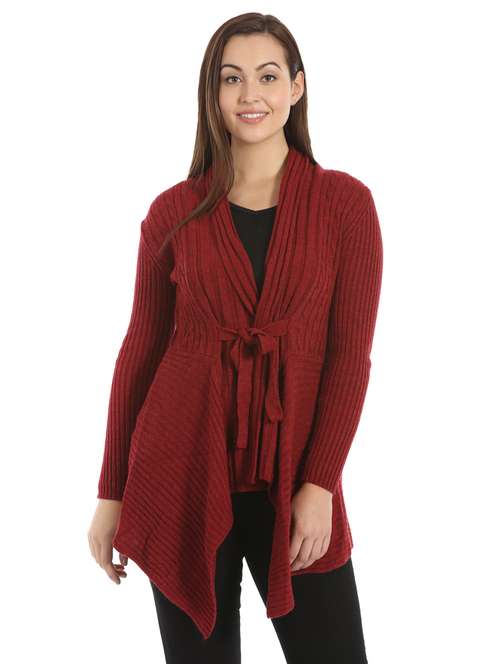 This red melange acrylic A-line cardigan for women is the best way to stay stylish and chic this winter. The shawl collar and full sleeves give it an extra cosy fit.
